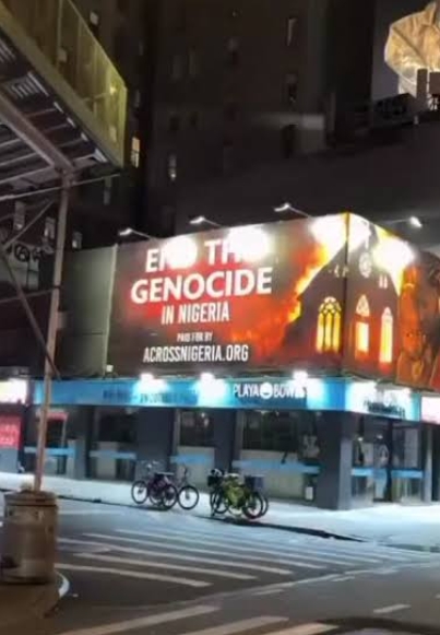 A large billboard in New York City has drawn attention after displaying a message about killings of Christians in Nigeria, with images placed beside the text.