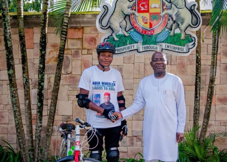 A cyclist, Wisdom Chisom who took off from Lagos on a bicycle, has arrived Nvosi, the country home of Abia State Governor, Alex Otti, after a six-day ride from Lagos.