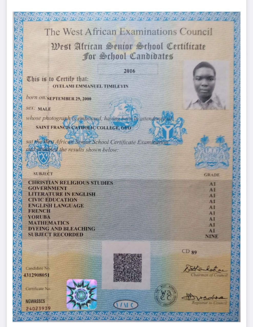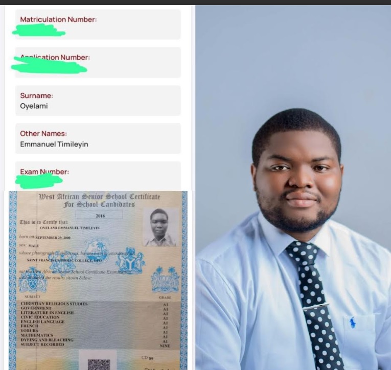 He bagged A1 in the following subjects: Christian Religious Studies, Government, Literature-In-English, Civic Education, English Language, French, Yoruba, Mathematics, Dyeing and Bleaching.