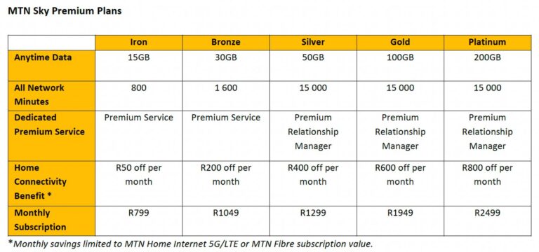 The MTN Sky Premium range is made up of five plans that incorporate data, all-network minutes, a home connectivity discount and a dedicated premium customer service offering. The home connectivity benefit is a rand value saving on MTN 5G, LTE fixed-wireless or fibre services, ranging from R50 off per month on the lowest subscription tier, to R800 off per month on the highest tier.
