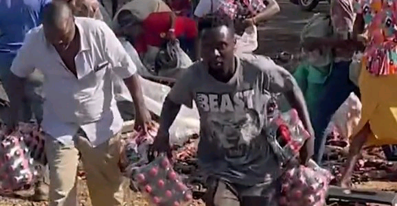 Kenyans Scramble For Packs Of Drink After Truck Overturns
