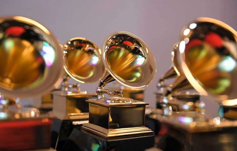 Grammy trophies sit in the press room during the 64th Annual GRAMMY Awards at MGM Grand Garden Arena on April 03, 2022 in Las Vegas. David Becker/Getty Images for The Recording Academy
